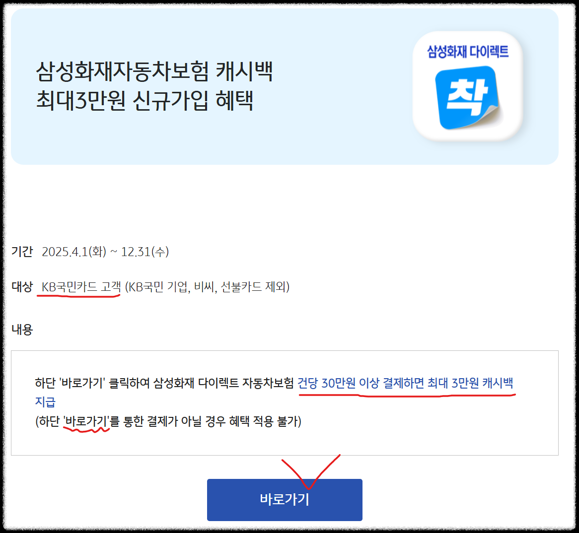 삼성화재자동차보험 캐시백최대3만원 신규가입 혜택 기간 2025.4.1(화) ~ 12.31(수) 대상 KB국민카드 고객 (KB국민 기업, 비씨, 선불카드 제외) 내용 하단 '바로가기' 클릭하여 삼성화재 다이렉트 자동