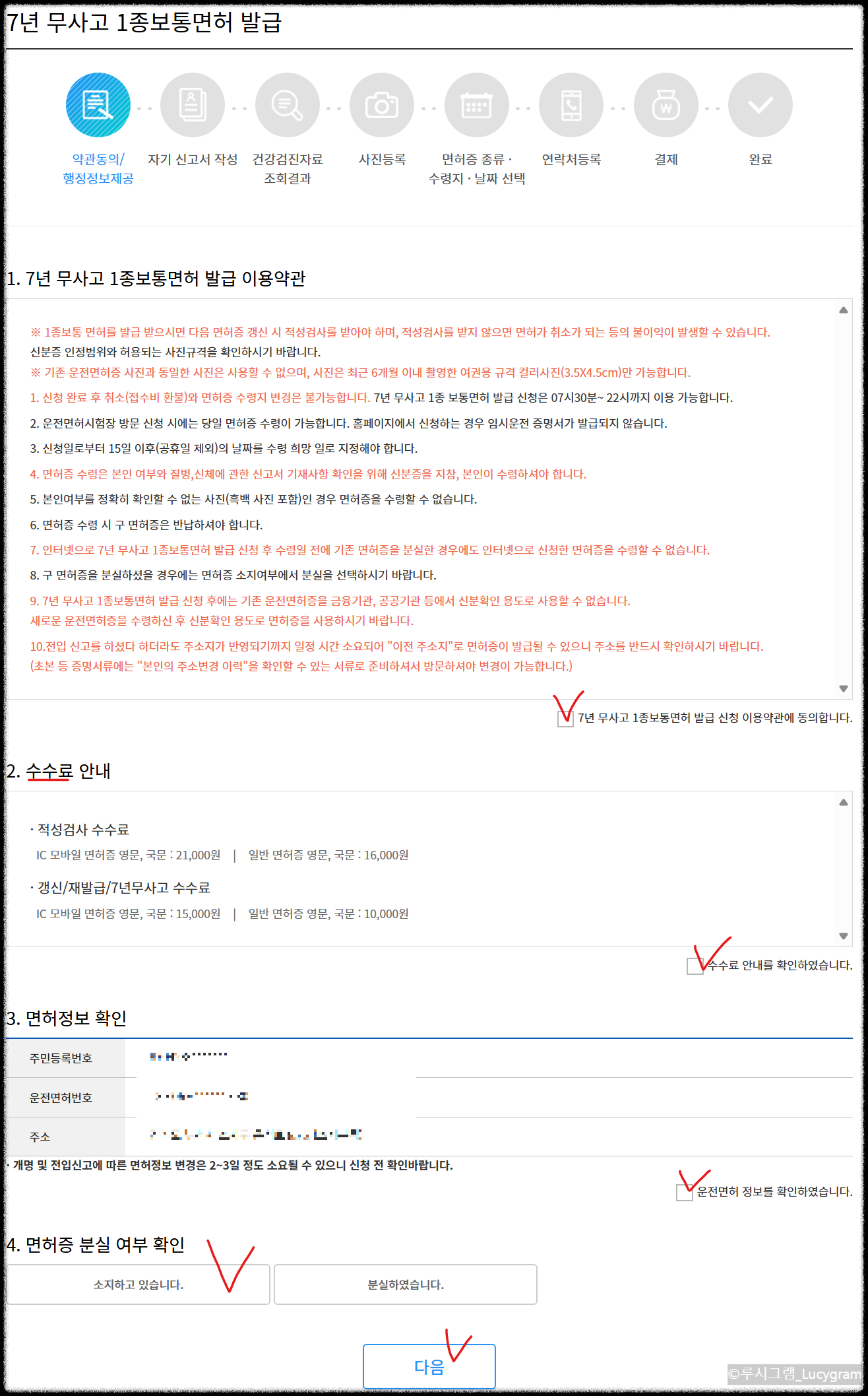 약관과 정보 동의 체크, 수수료 확인. 면허증 찾으러 가실 때 기존에 가지고 있던 운전면허증 반납하고 찾을 수 있어요. 4번 면허증 분실 여부 잘 생각하시고 체크하세요. 체크 후 다음 클릭합니다.