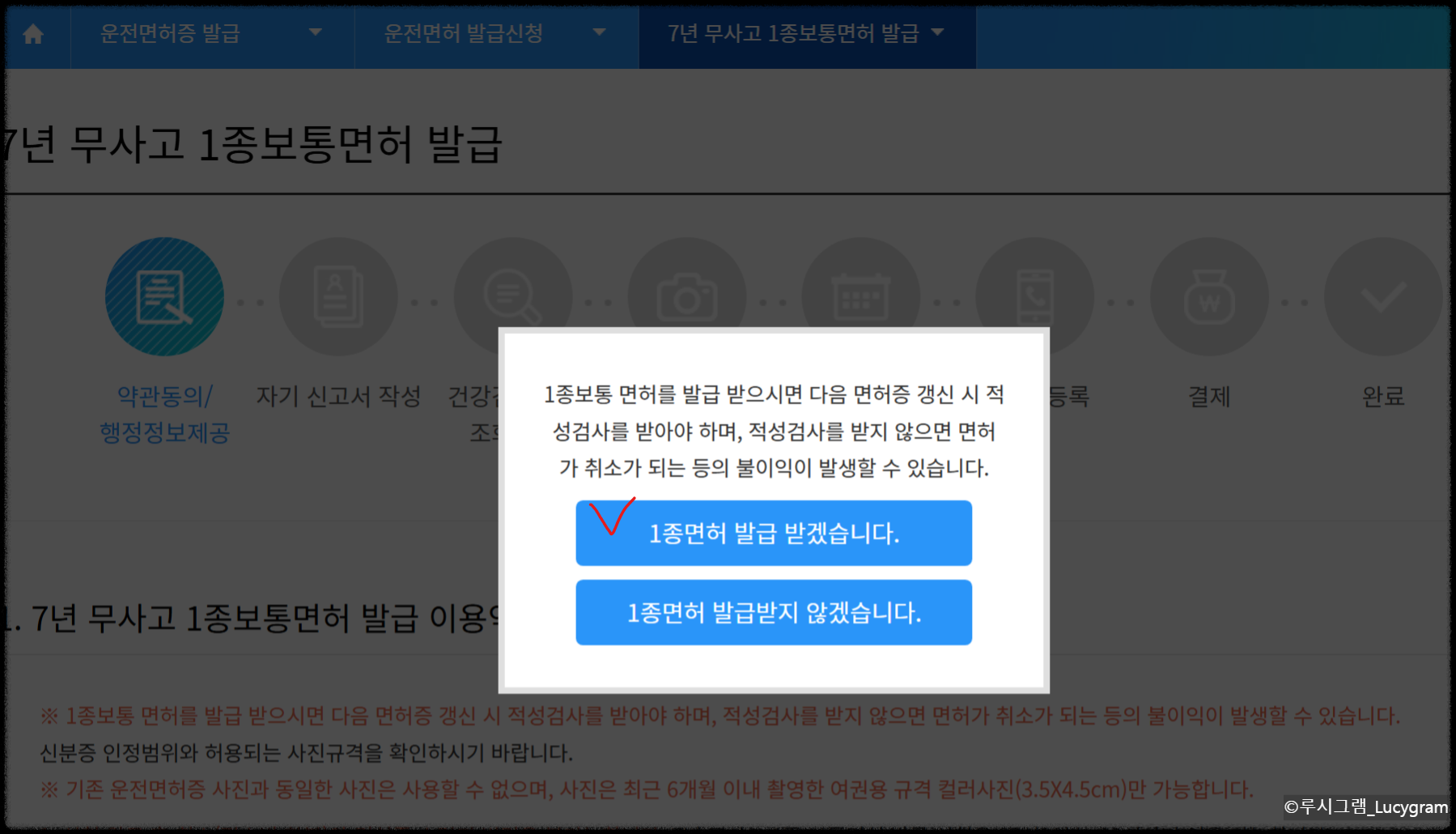 빨간 괄호 안에 있는 목록을 보고 나에게 맞는 사항에 클릭합니다. 7년 무사고 1종보통면허 발급 선택!