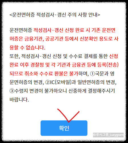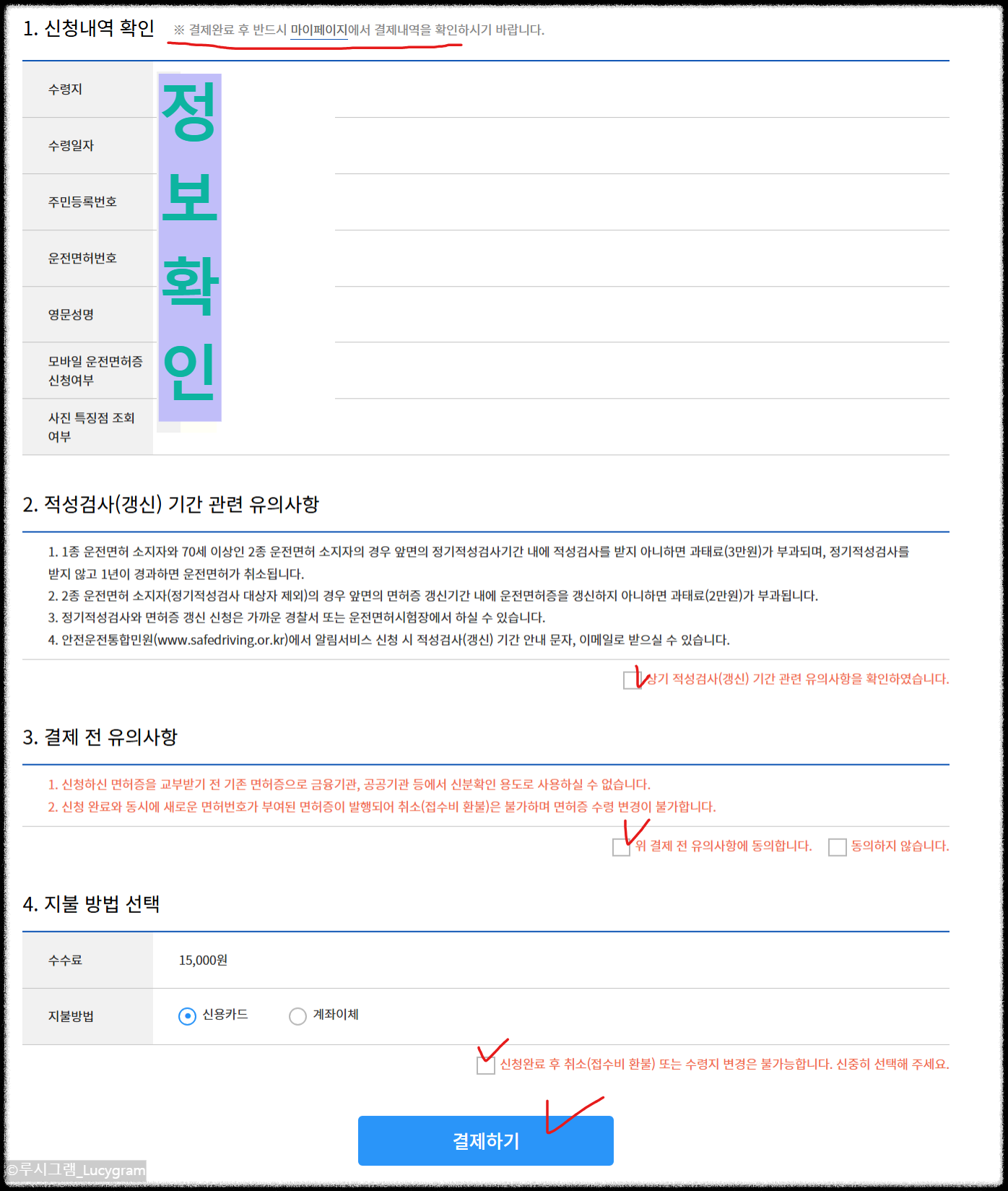 2종 면허증 갱신을 진행할 때는 약관 전체 동의를 먼저 체크하세요. 그다음 수수료와 면허 정보가 맞는지 반드시 확인해야 합니다.