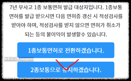 안내 사항을 꼼꼼히 읽어보세요. 2종 보통면허는 적성검사를 하지 않지만, 1종 보통면허는 적성검사가 필수입니다. 또한 갱신 주기도 다릅니다. 이 점을 참고하셔서 본인에게 맞는 종류로 발급받으시면 됩니다. 저는 신체검사 조회가 되지 않아 이번에는 2종으로 신청했어요.