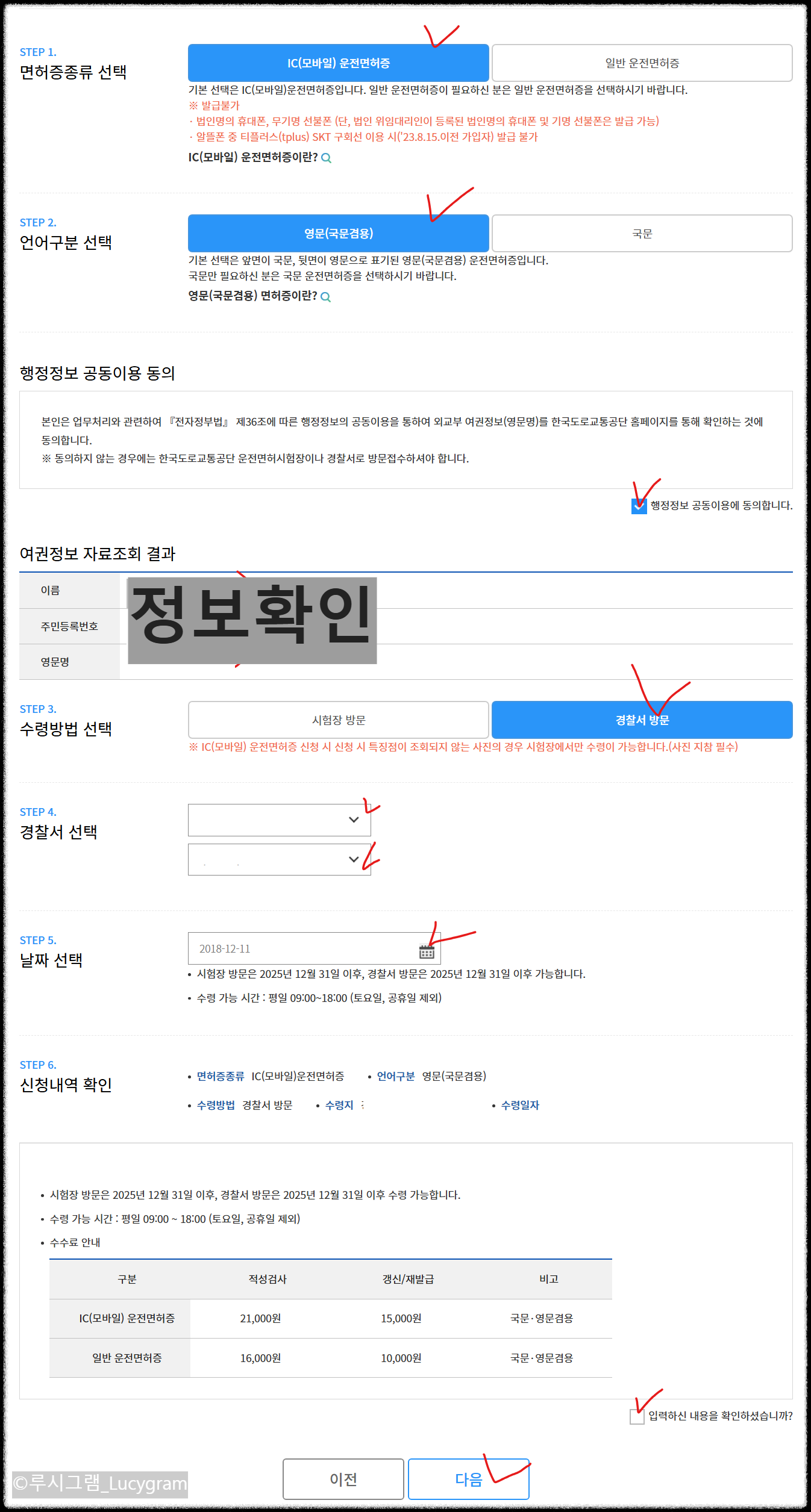 STEP 5. 면허증 종류와 수령지 날짜 선택