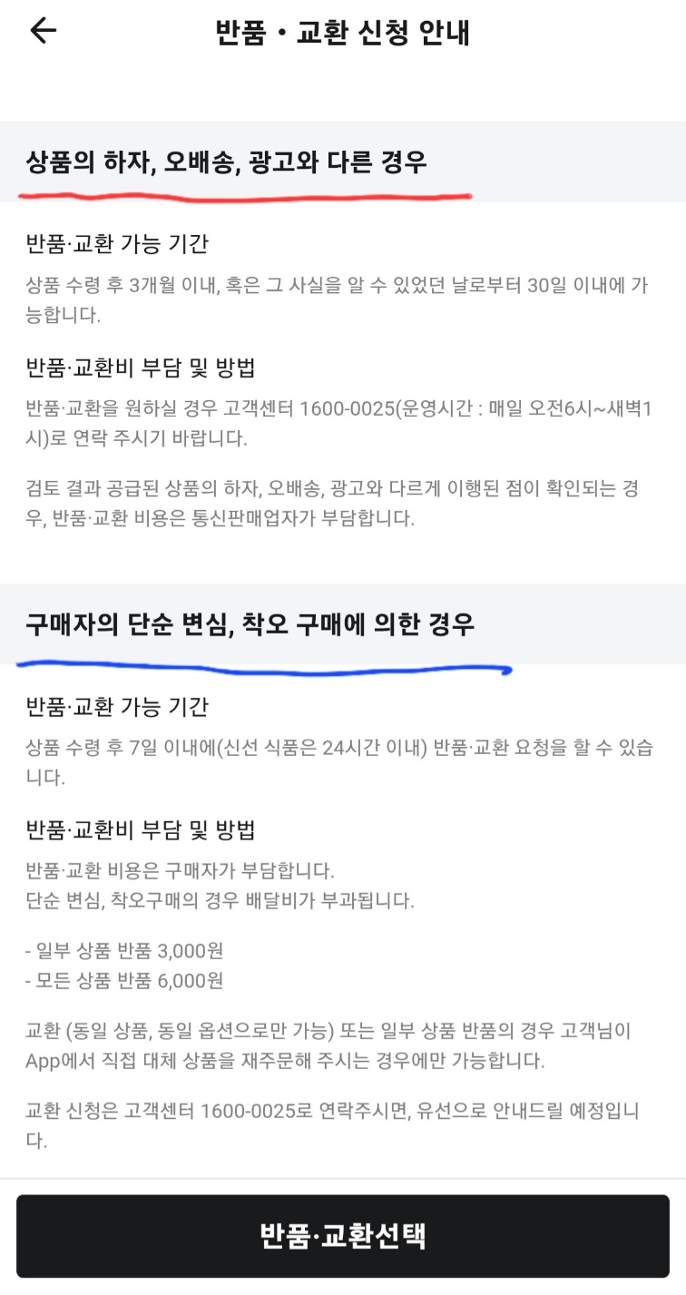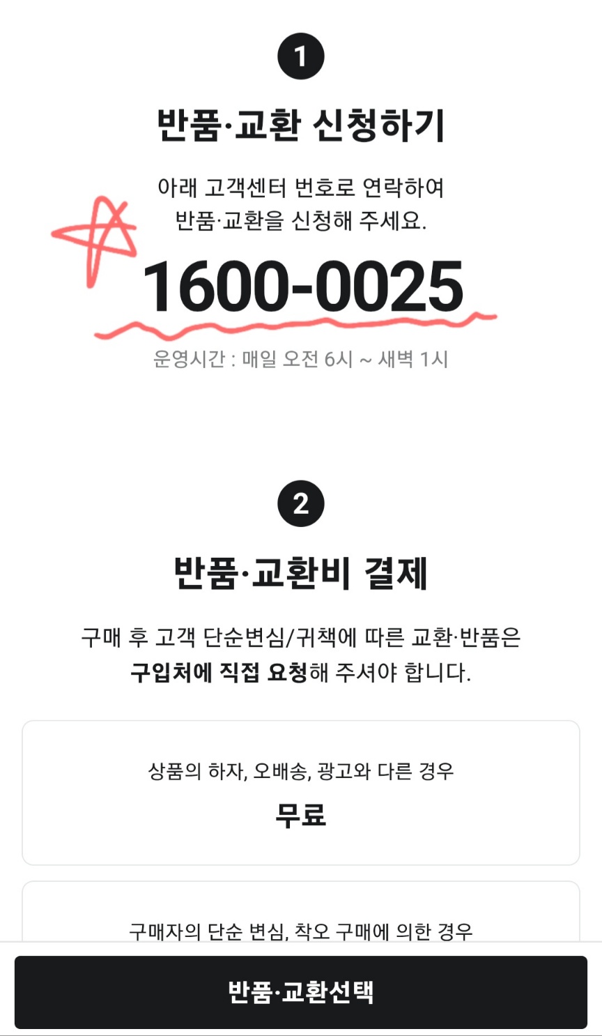 스크롤하면 ‘반품·교환’ 버튼이 있다.