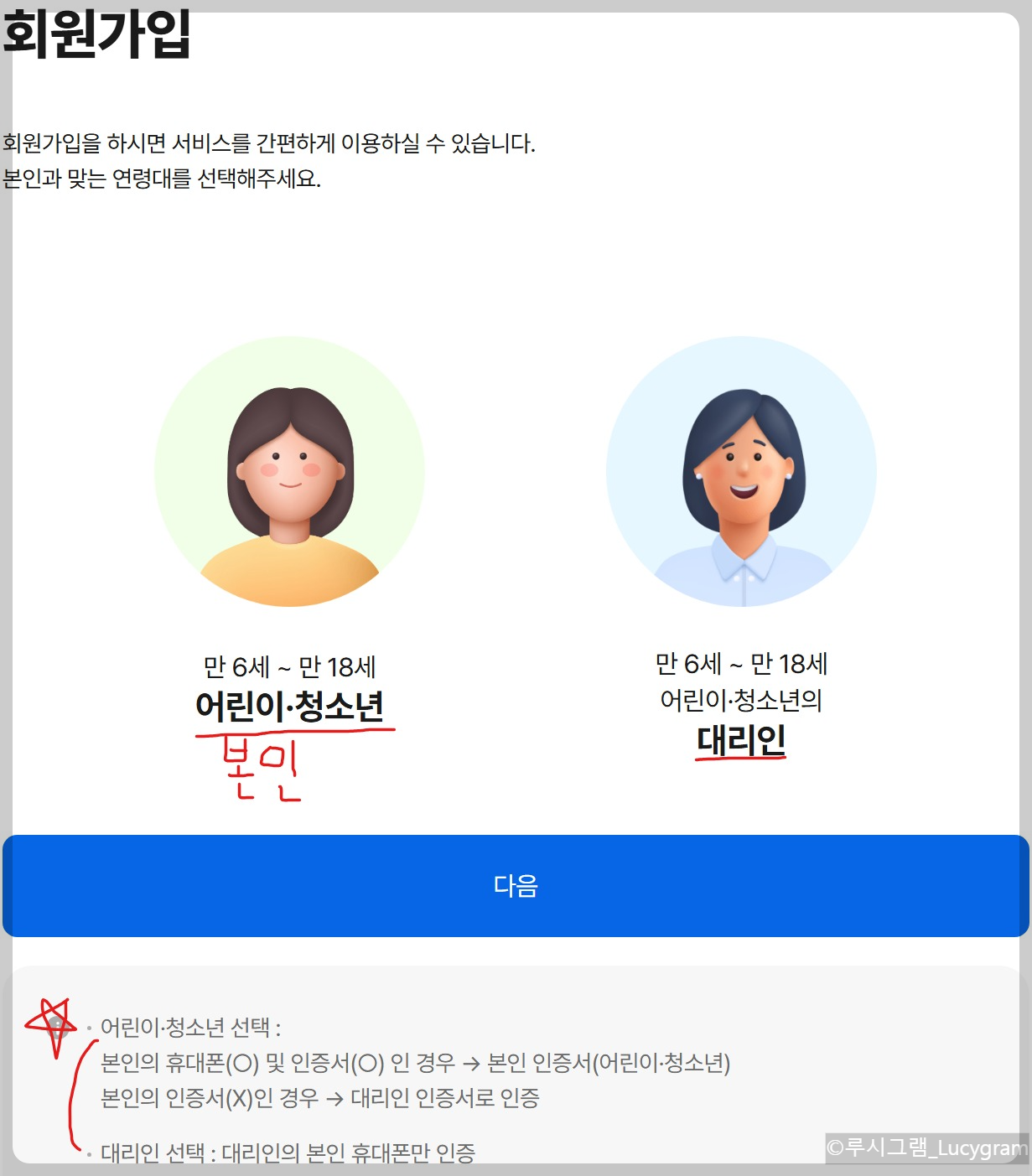 회원가입은 어린이·청소년(본인) 또는 대리인(부모님) 중 편한 방식으로 선택하실 수 있습니다.