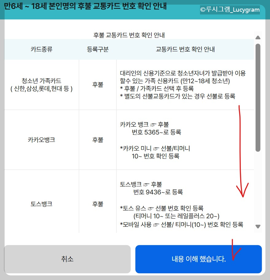 <해당 카드 번호 확인 안내문>이 나타나요. 안내 내용을 끝까지 스크롤해 읽은 뒤 [내용 이해했습니다]를 클릭