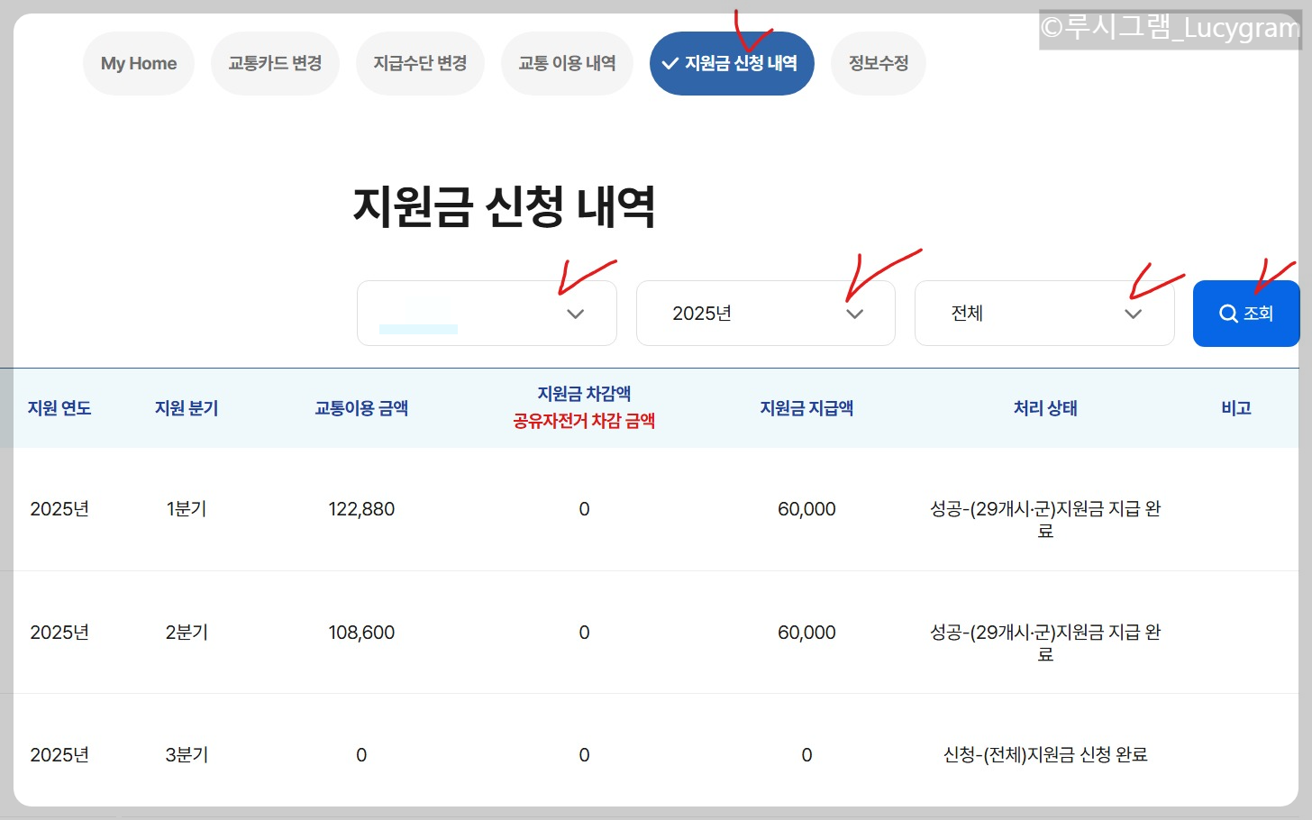 또한, 경기도 어린이 청소년 교통비 지원금 사이트에서 [지원금 신청 내역] 메뉴를 통해 지금까지 받았던 내역을 조회할 수도 있어요.